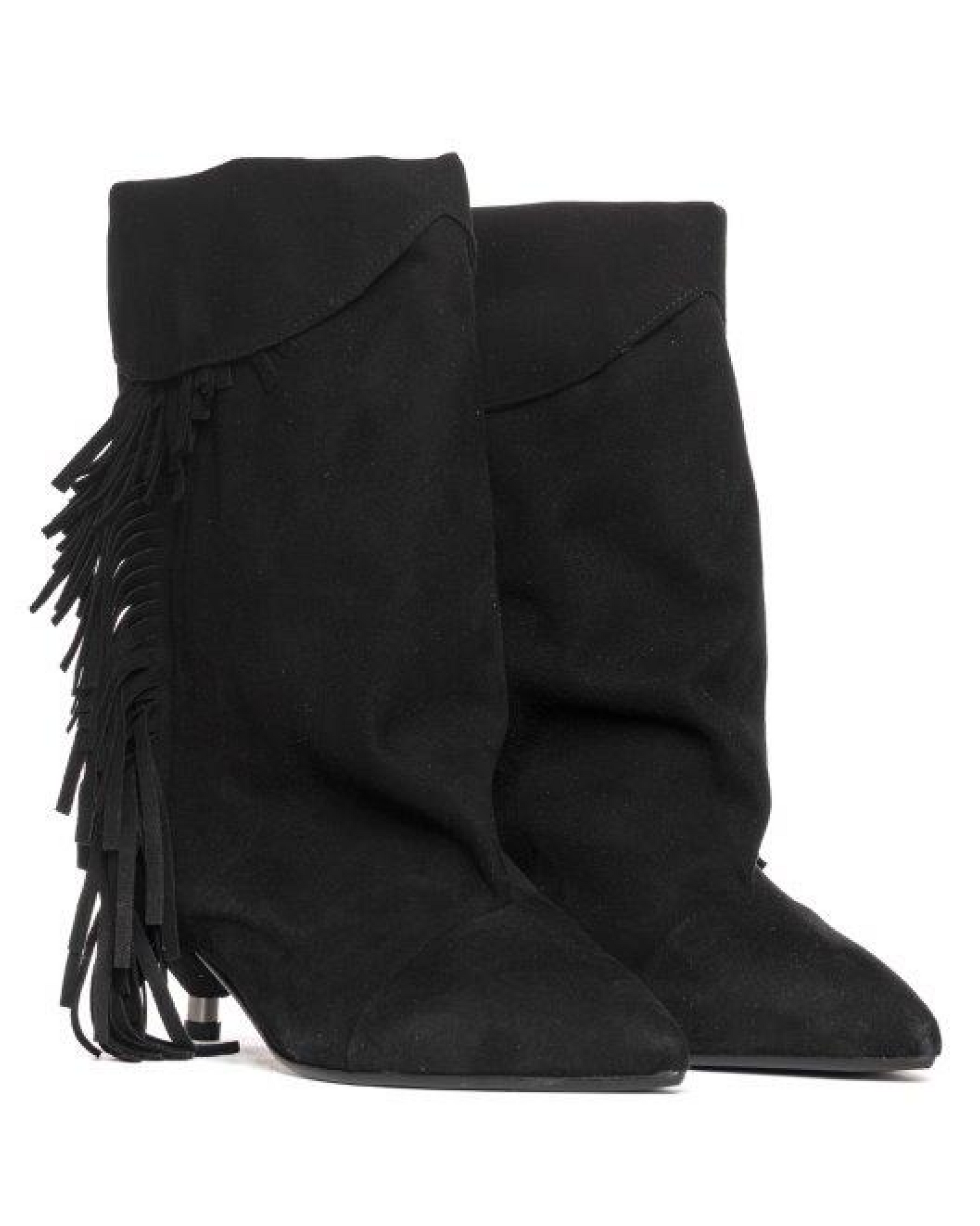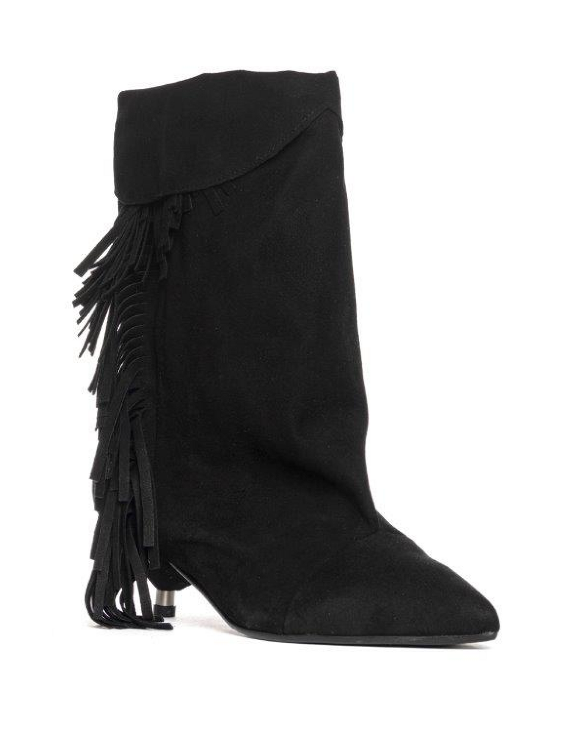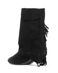 - Sleek silhouette with a mid-height shaft and fringe detailing that adds texture and movement.
