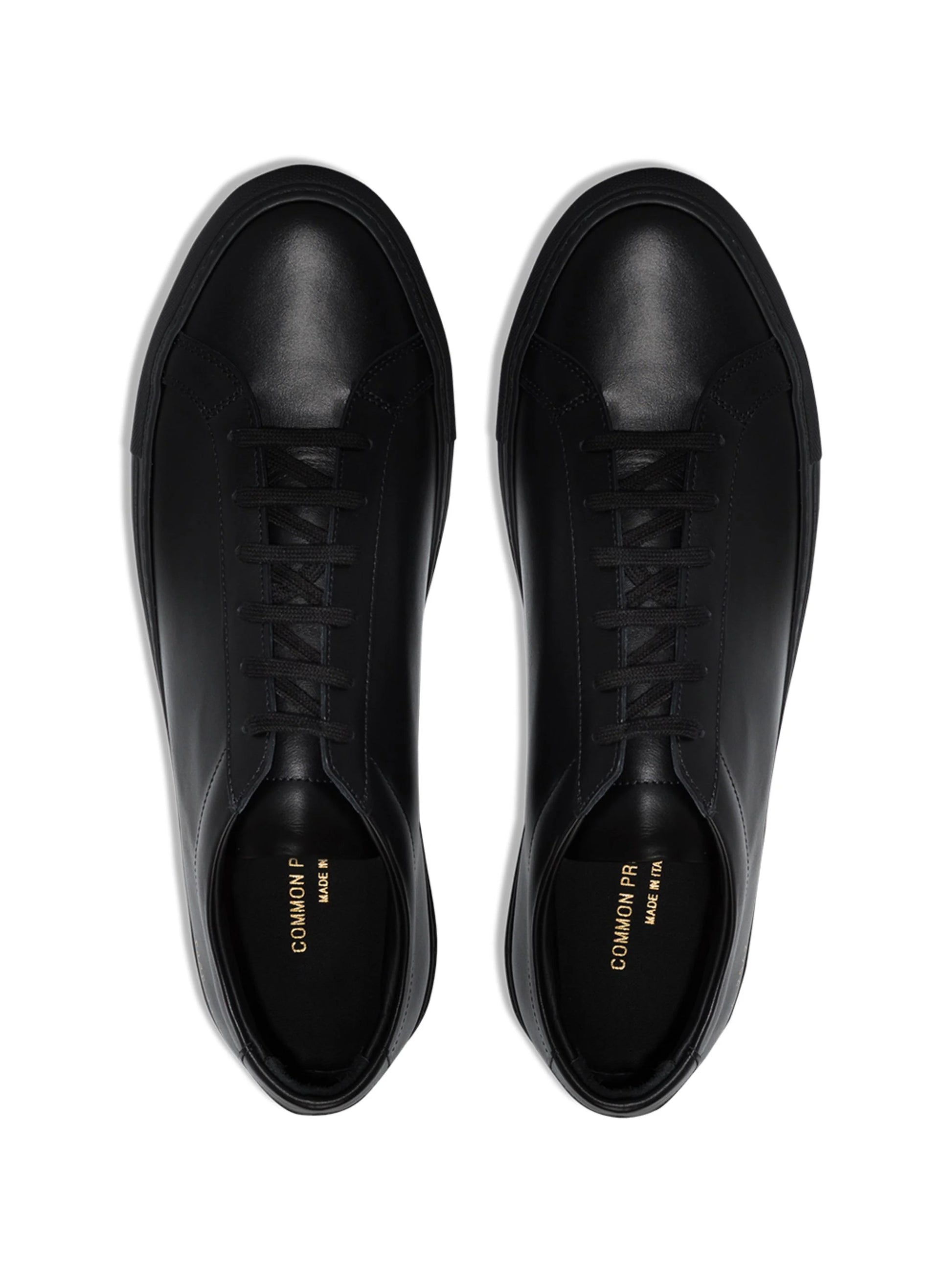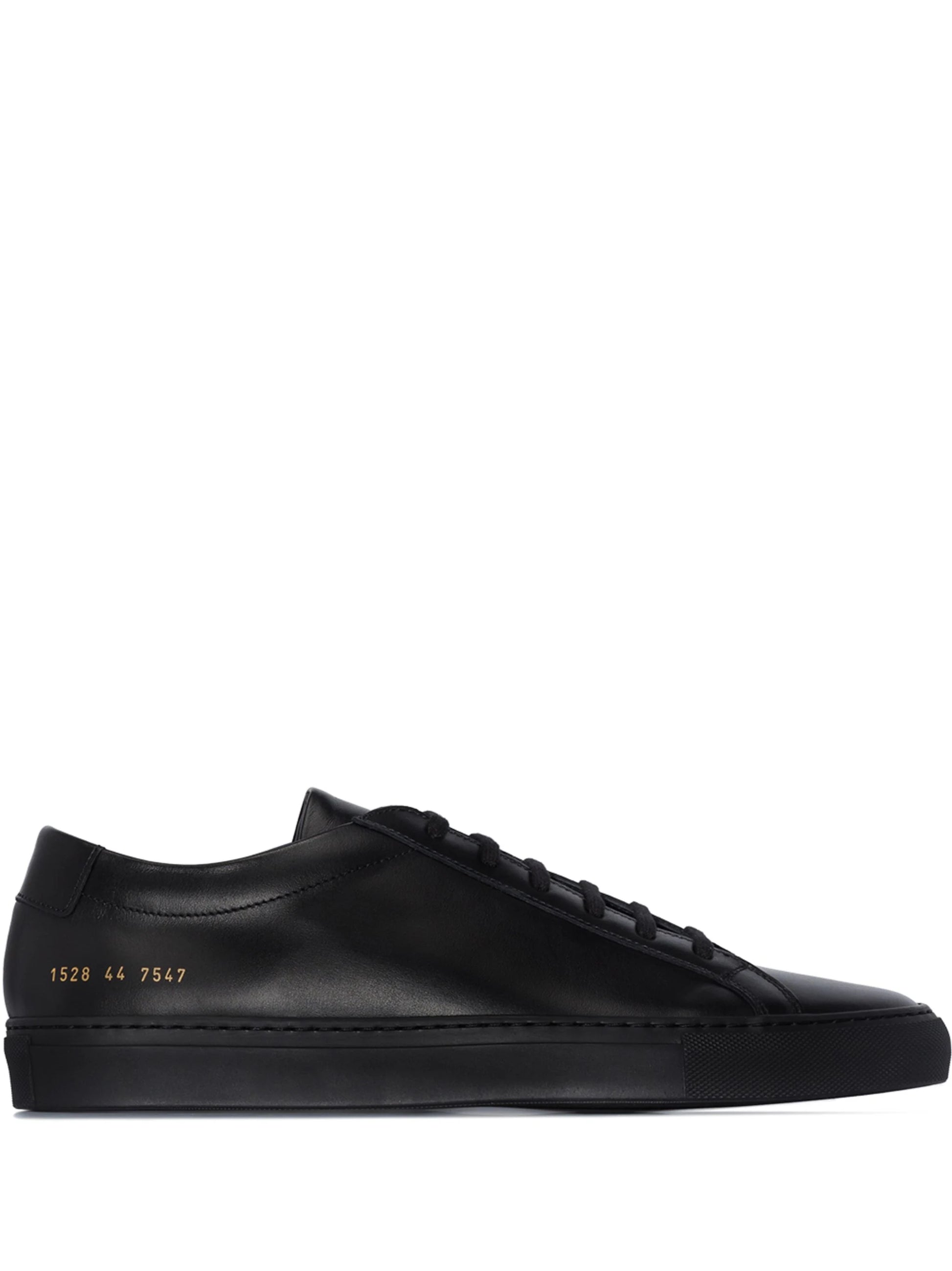 These black Common Projects Achilles low-top leather sneakers feature a round toe, lace-up front, gold foil serial stamp at the side, and flat rubber sole. These Common Projects sneakers are ideal for you, as — just like Achilles himself — you are a true warrior.