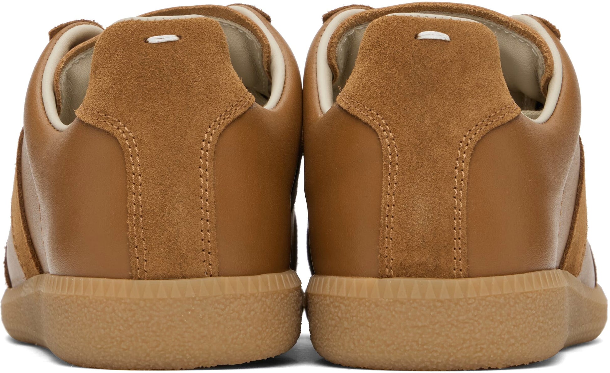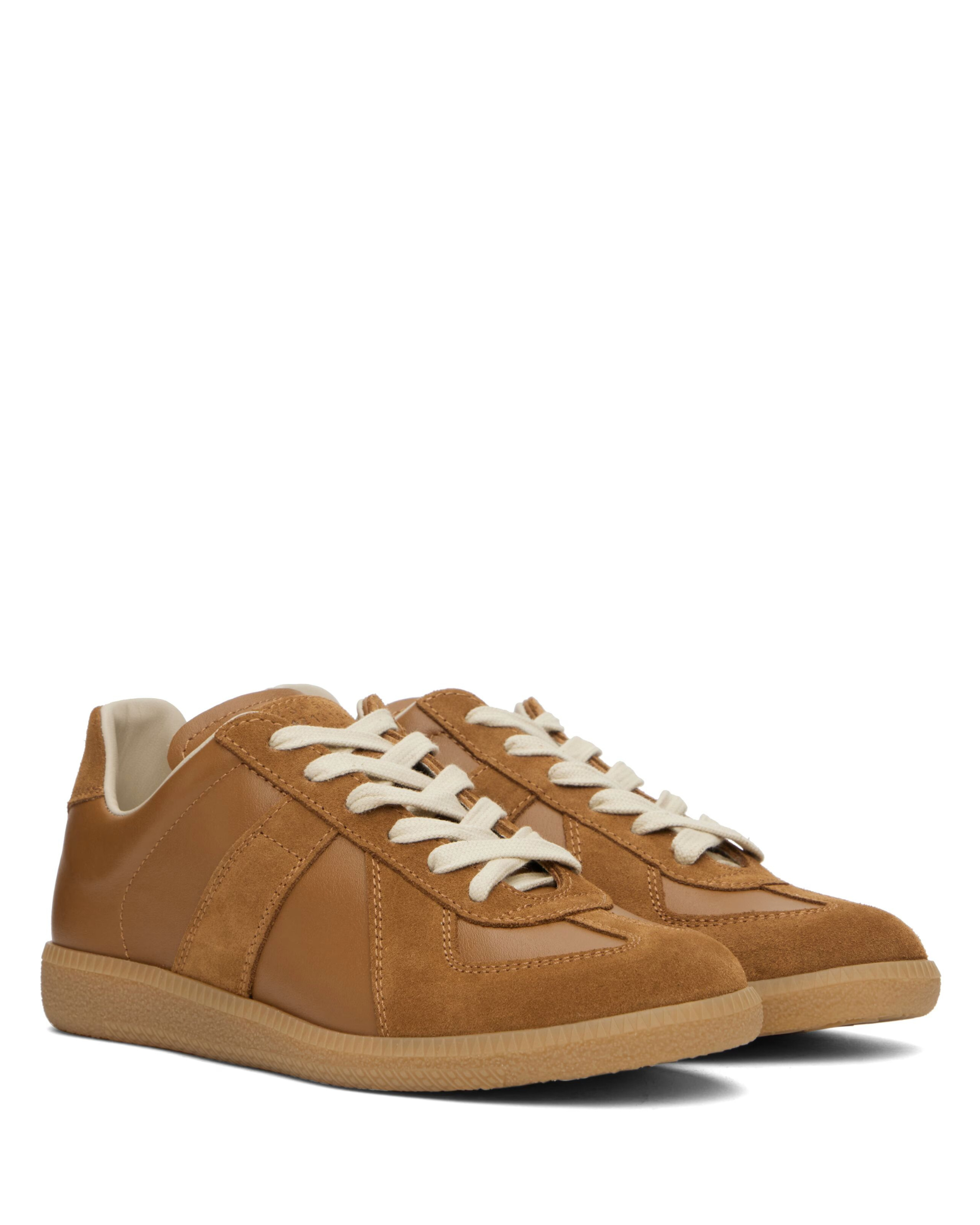 The Replica Sneakers from Maison Margiela offer a refined take on a classic athletic silhouette. Inspired by vintage German army trainers, this design features a rich blend of leather and suede in a sleek, neutral palette. With a soft lining and signature numbered logo, the Replica is a staple of the Maison's archive-inspired approach.