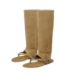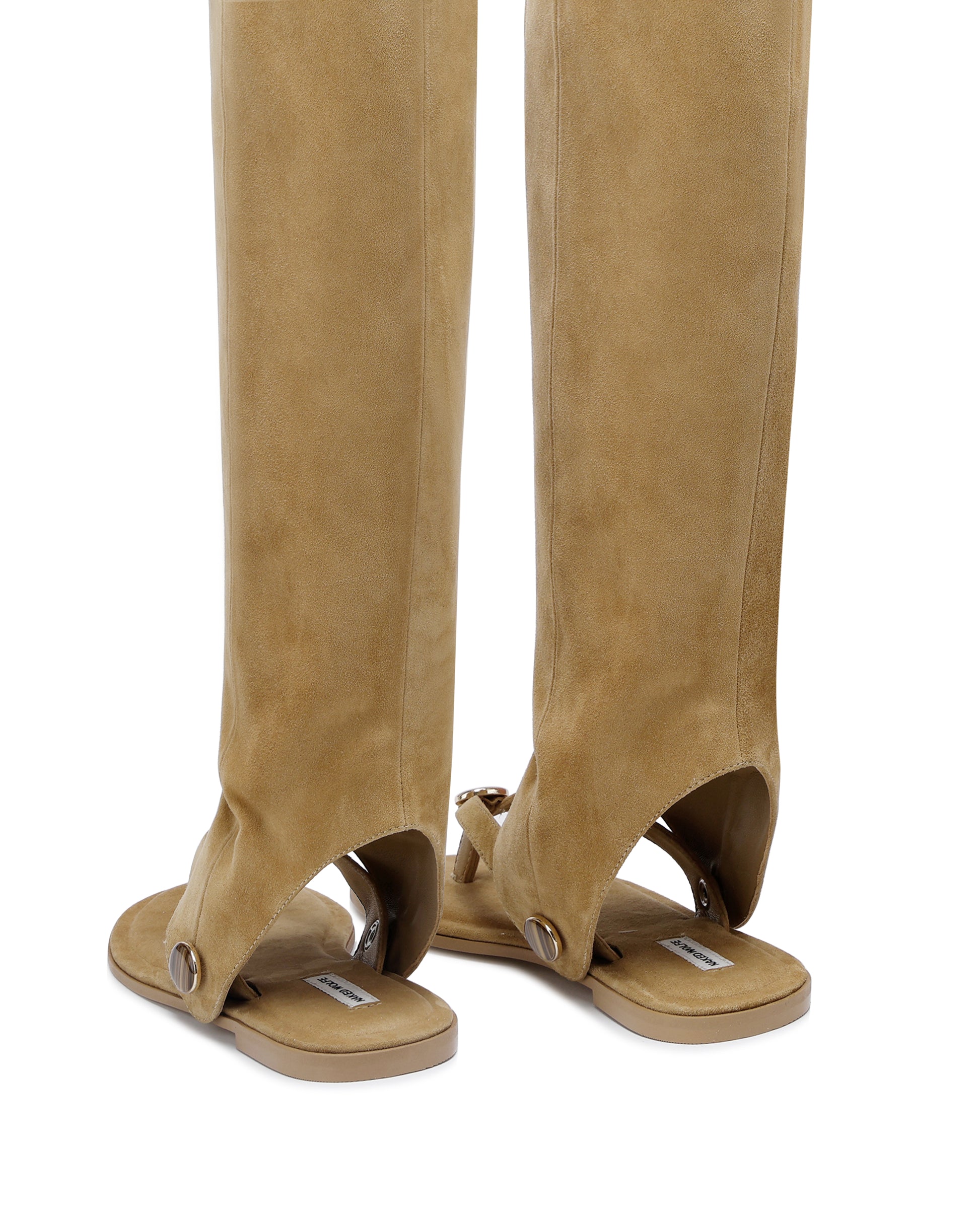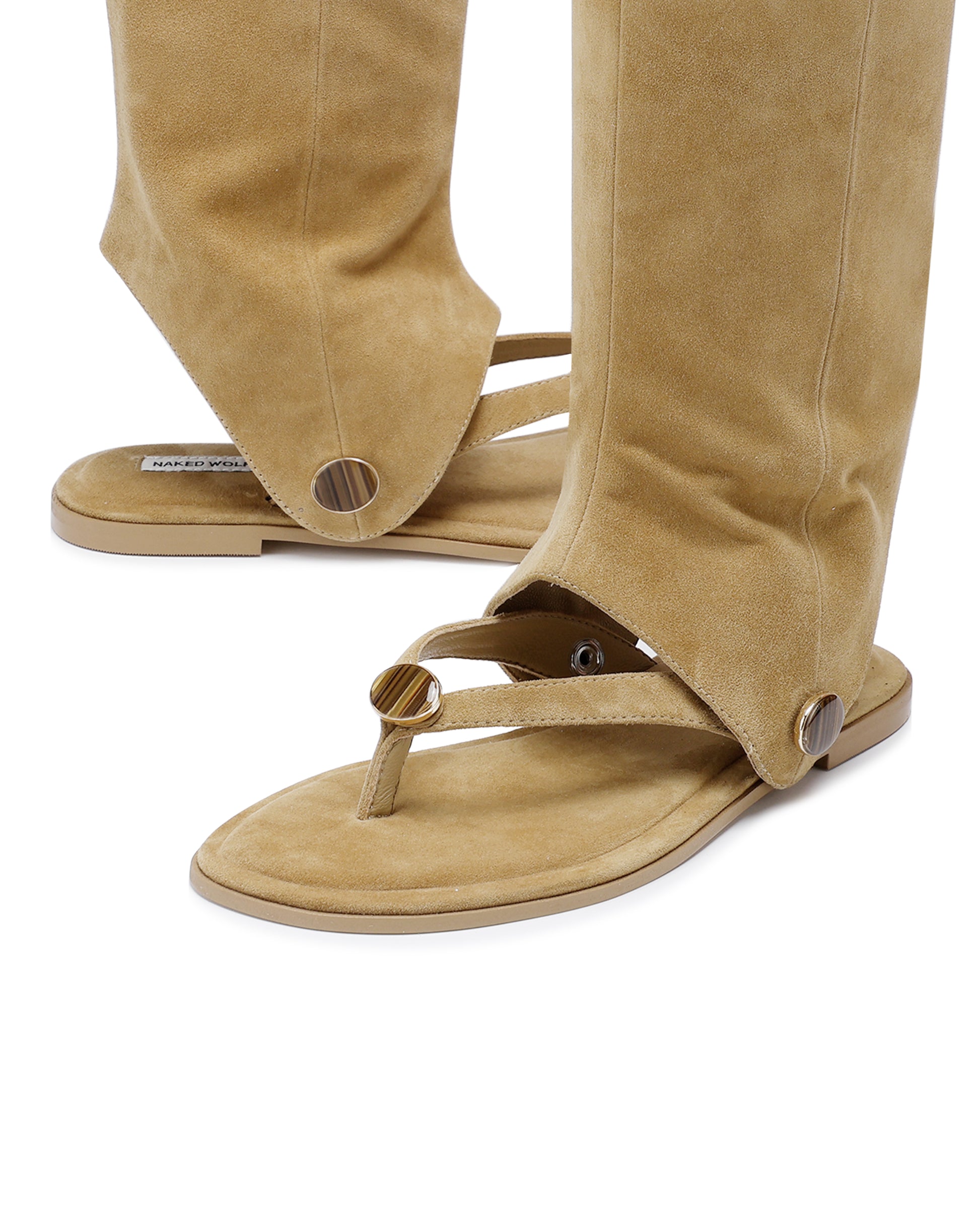 Introducing Sammy, our exquisite new sandal from the Naked Wolfe collection. Featuring a removable suede leg piece attached with poppers for versatile styling, and adorned with tiger eye stone detail. Sammy features a well cushioned insole for good wear and comfort. Crafted with premium kid suede for a luxurious touch. Elevate your wardrobe with this elegant and exclusive design.