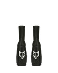 Ankle boot skin tight fitting platform made with a vegan friendly leg hugging stretch upper material on a custom designed Naked Wolfe platform and heel construction. Featuring our Naked Wolfe “wolfe” head plaque on the heel and a metal “wolfe” head plaque embedded into the heel.