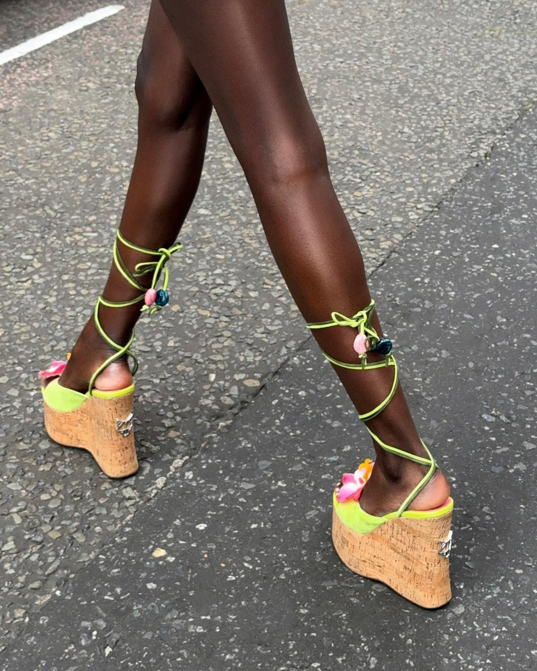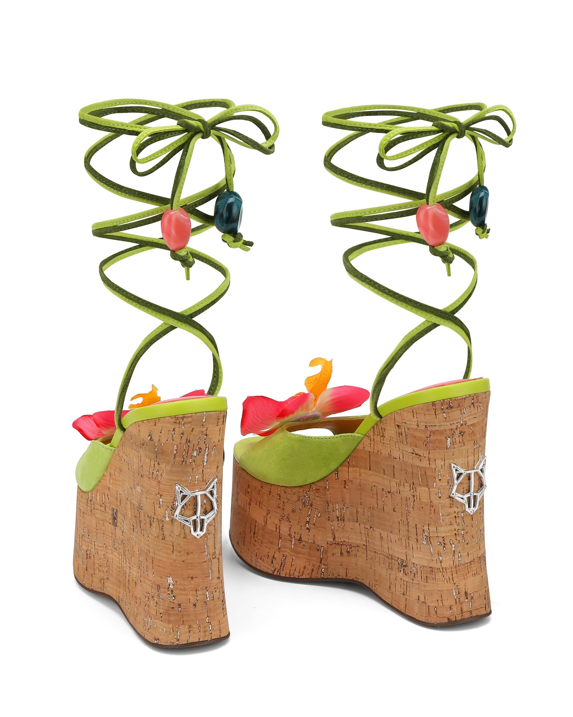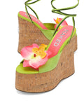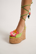 Sunflower is our brand new wedged heel with a peep toe design perfect to complete a summer look. This style has a super cute soft green suede upper design with a striking pink flower, Summery ankle tie with a beaded finish to match and a Glitter cork wrap featuring the famous wolfe head plaque on the heel.