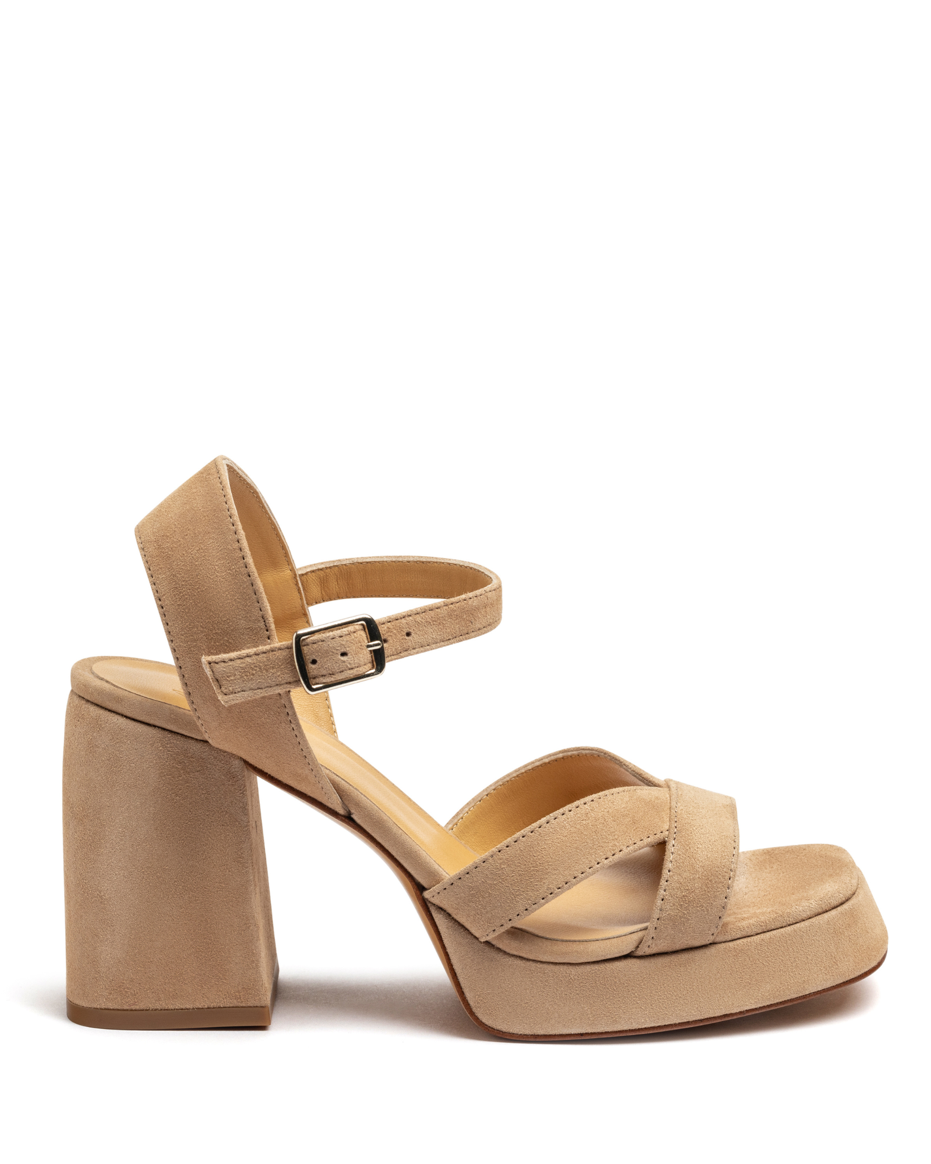 Vero sandal in suede with buckle closure, cushioned insole, V-neck and 10cm heel lined to match.