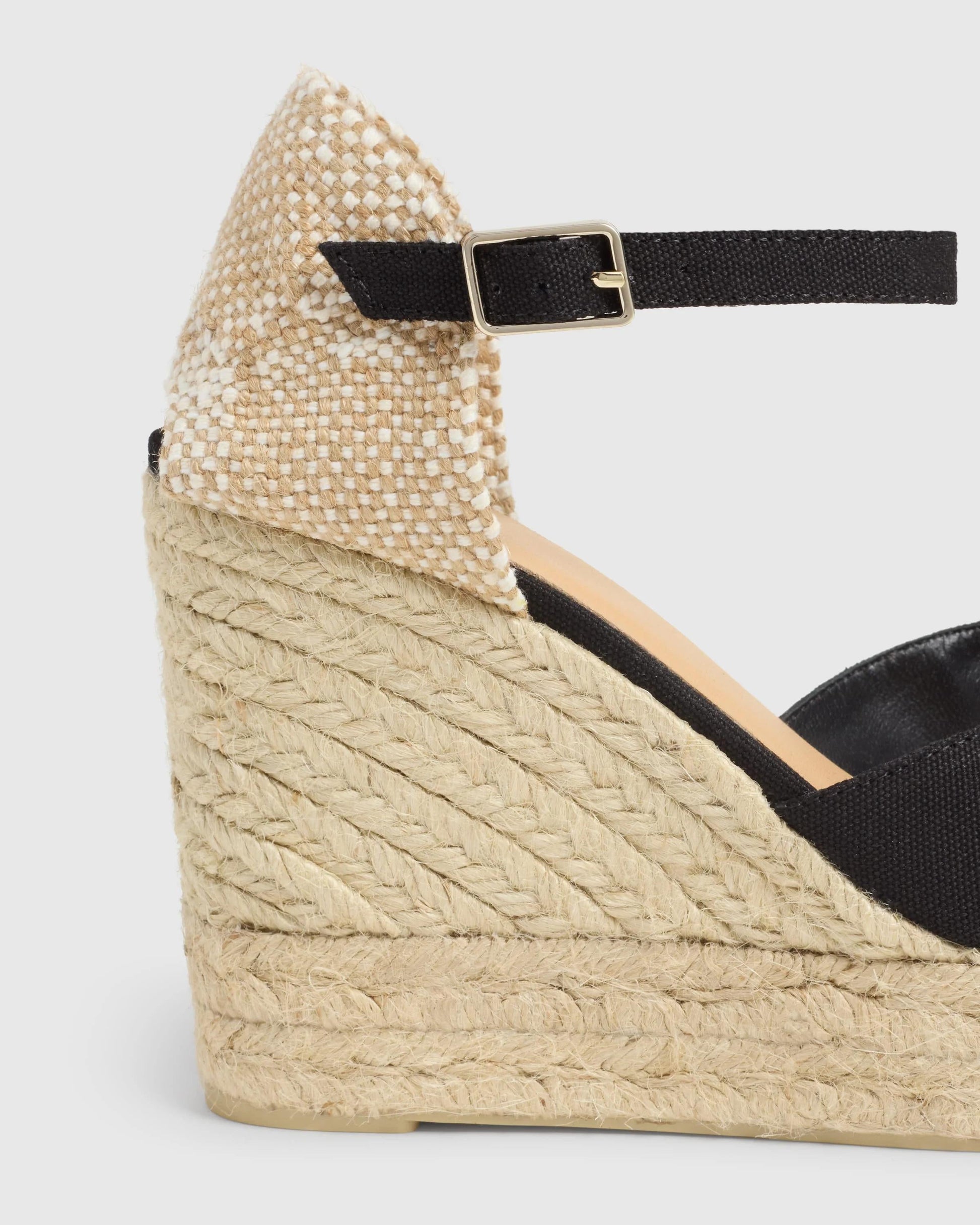 Bianca peep-toe style sandal in organic cotton, with buckle closure, cushioned insole and 11cm jute wedge with double platform.