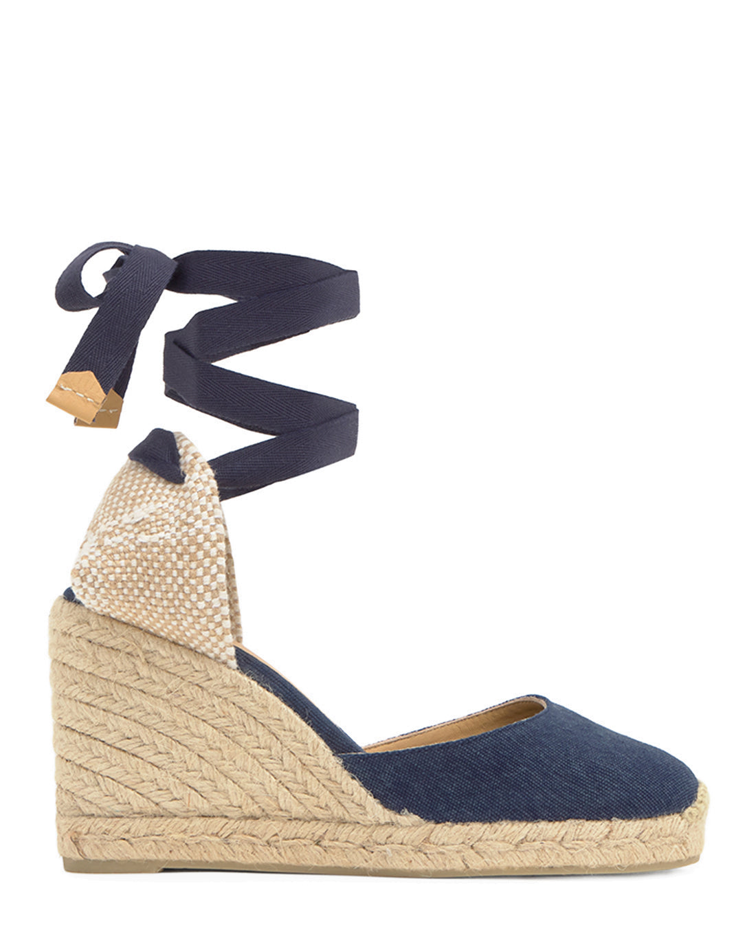 Iconic Carina espadrille in organic cotton with lace-up closure, cushioned insole and 9 cm jute wedge.