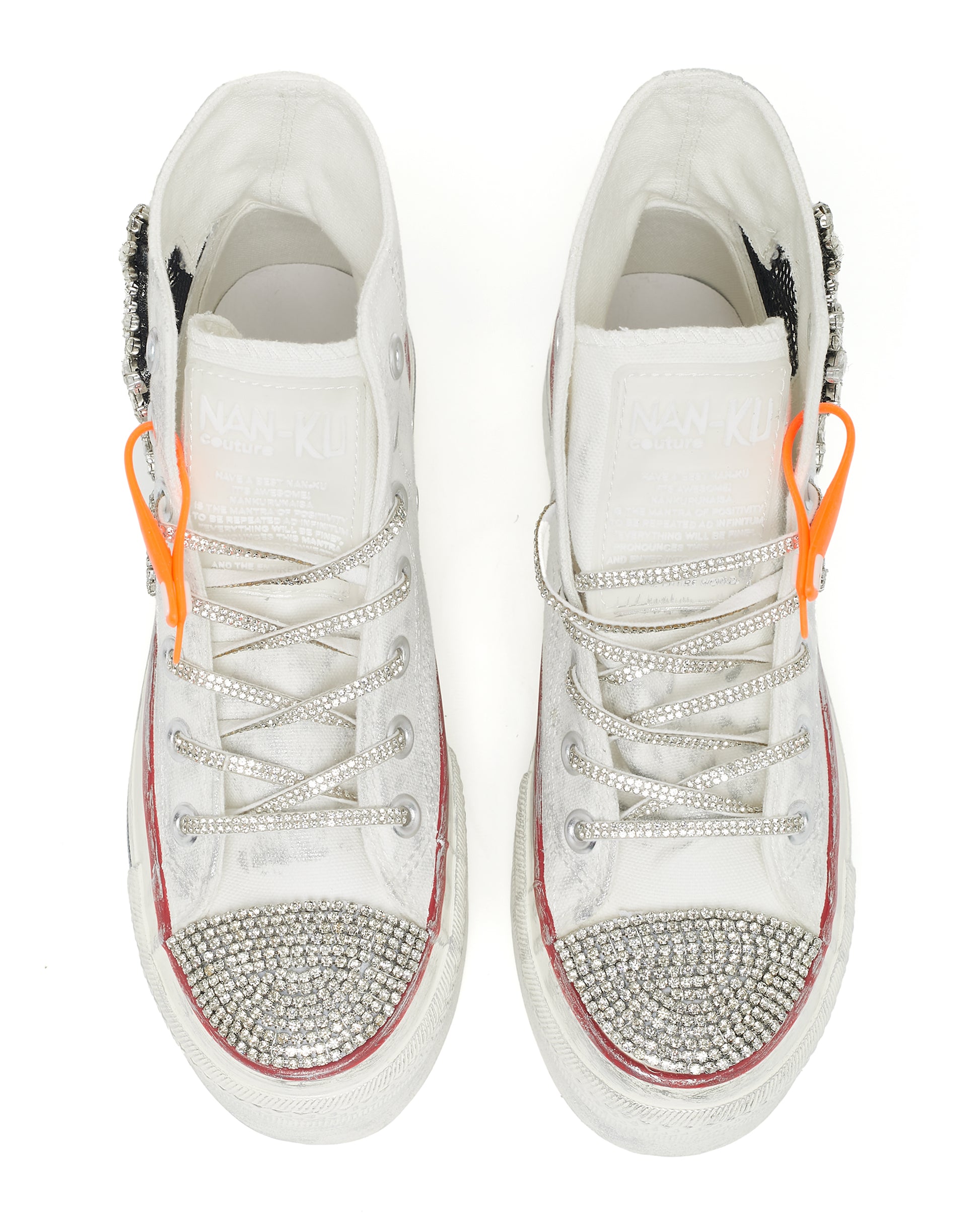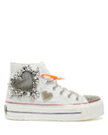 Elevate your style with our High Top Canvas Trainers- KHAI, featuring a canvas upper and lining for comfort and breathability. But what truly sets them apart are the dazzling crystal embellishments and crystal-covered lace and toe cap, adding a touch of glamour and sophistication. With a platform sole for added height and comfort, these trainers make a bold statement for those seeking a unique and eye-catching look.