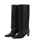 Cut from quality leather or suede with a softly structured shaft, this knee-high boot brings together minimalism and drama in equal measure. The elongated, pointed, square toe and mid-height heel strike a perfect balance between polish and power. A subtle slouch adds movement and ease, while the signature Nokwol stainless steel pin on the heel marks it with quiet confidence. Finished with a smooth leather footbed, leather and textile lining, and a sleek resin outsole, Nice is your go-to for elevated everyday - or a bold night out.