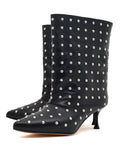 Masterful Embellishment: A dense, uniform constellation of Polished Silver-Tone Dome Studs blankets the entire boot, from the elongated, Precision Pointed Toe up the mid-calf shaft. The consistent application of hardware provides a visual texture that is both rebellious and richly opulent.