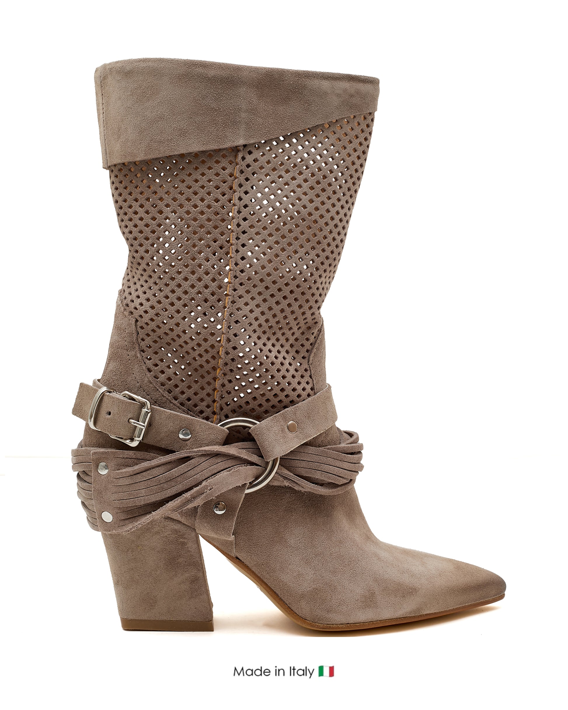 Equal parts rock and romance, this taupe suede mid boot combines breathable laser-cut perforations with a dramatic multi-strap harness. Foldable cuff styling offers two looks in one.